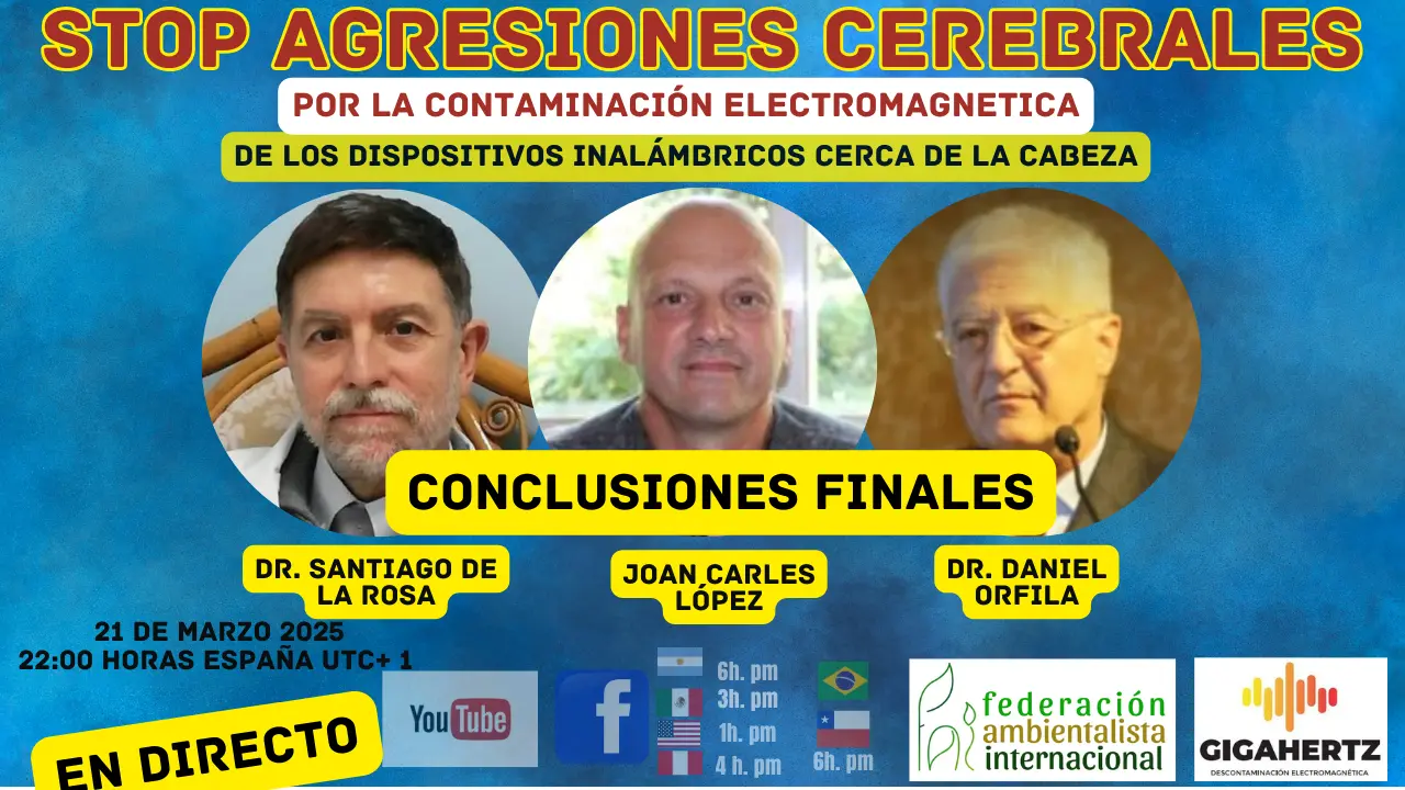Conferencia online sobre las agresiones cerebrales propiacidos por los auriculares inalámbricos, bluetooth, wifi, que producen efectos en la salud, Con el Dr,.Santiago de la Rosa, el experto Joan Carles López y el Dr. Daniel Orfila